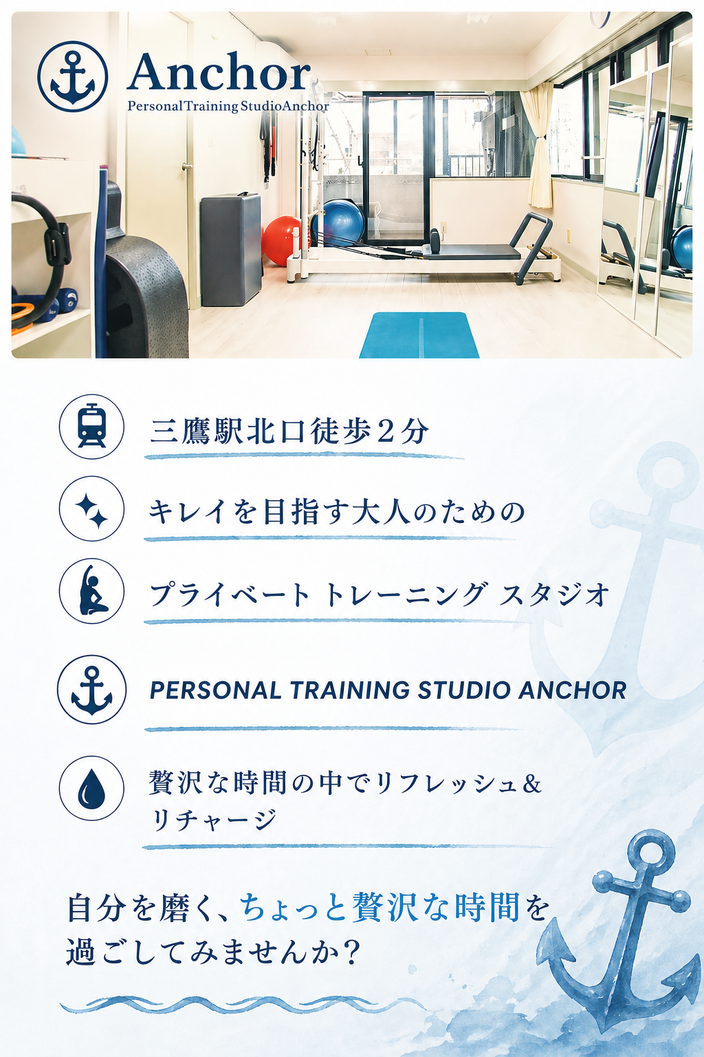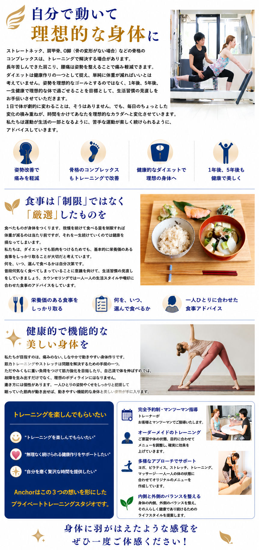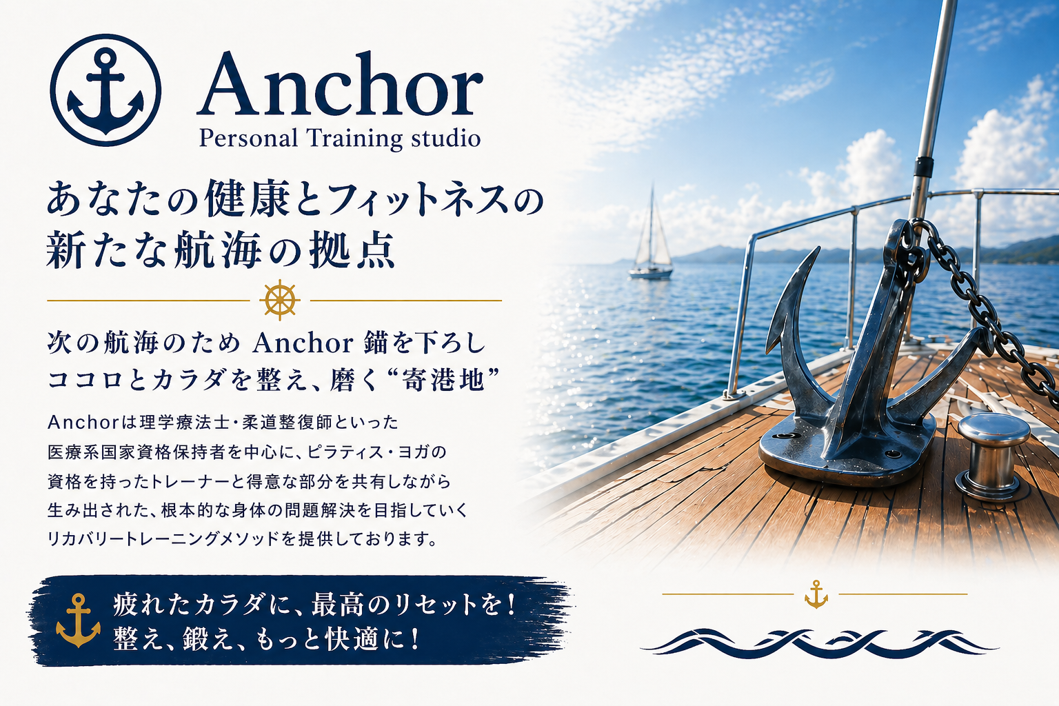 ANchorは理学療法士・柔道整復師といった医療系国家資格保持者を中心に、ピラティス・ヨガの資格を持ったトレーナーと得意な部分を共有しながら生み出された、根本的な身体の問題解決を目指していくリカバリートレーニングメソッドを提供しております。